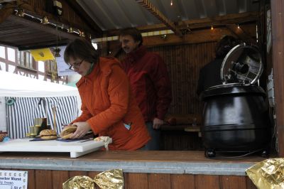 Silla und Jürgen bieten zum ersten Mal ihre brutzel- braunen Kartoffelpuffer mit Apfelmus an und schenken Hochprozentiges aus, was ja recht gut zusammenpasst, das deftige Essen muss ja verdaut werden. Einen guten Appetit.