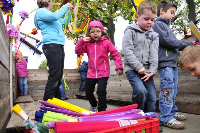 Die Erntekrone hängt schon mal an ihrem erhabenen Platz und schaut auf das werkelnde Volk herab. Die zum Glück nicht welkenden Rosen suchen auch noch den ihrigen, aber zu nächst sind andere Dinge wichtiger. Theke klar machen - für Daniela und die andern Mädels keine Sache. Auf der Bühne haben die Malerinnen genügend Platz gefunden, um von den Kids beraten, die richtigen Pinselstriche zu machen.