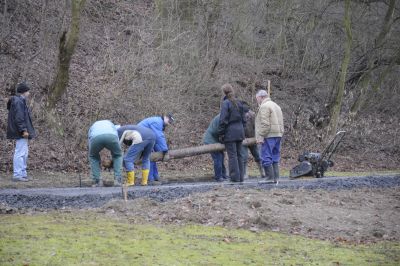 Die Stämme werden eingepasst und es wird Erde beigefüllt um Stabilität zu bekommen. Der Schotter wird noch ein mal begradigt.