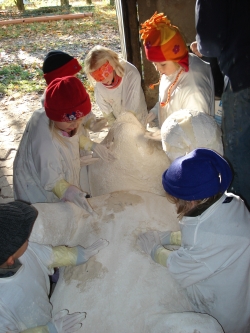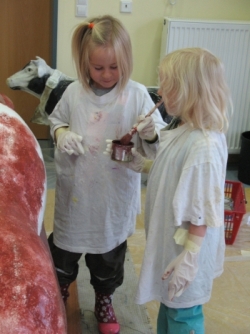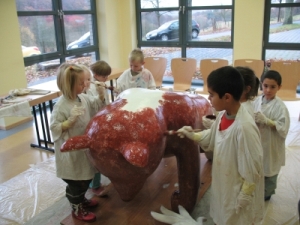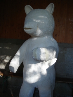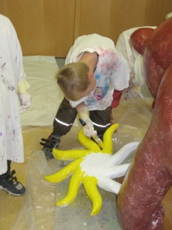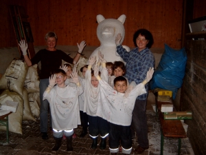 Zusammen mit dem Hobbykünstler Jürgen Behrens basteln die Kinder einen zwei Meter großen Sonnenbären, der voll und ganz ihren eigenen Vorstellungen entspricht. Und weil ein Bär eben immer noch ein Bär ist, wollten die Kinder erst gar keine Verwechslungen mit einem drolligen Kuscheltier aufkommen lassen und einigten sich auf ein möglichst natürliches Erscheinungsbild. "Die Kinder sind absolut diszipliniert und haben eine Fingerfertigkeit, als hätten sie schon immer in diesen Größen gearbeitet", sagt Jürgen Behrens. Der Künstler staunt selbst, welche Dimensionen das Projekt inzwischen aufweist. In den vergangenen Wochen hat das neue Maskottchen Form angenommen. Aus einem gigantischen Styroporhaufen haben die Kinder Bärenkonturen gesägt, Rundungen heraus gefeilt und dem Tierchen eine Ganzkörpermassage mit Putz und Harz verpasst, anschließend noch die Farbe aufgetragen. Dabei durften sogar die Zweijährigen helfen, die seit dem Sommer in den Kindergartengruppen integriert sind. ”Lebensgroß, stahlverstärkt und mit einer riesigen Sonne in der braunen Tatze ist der "Sonnenbär" fertiggestellt.