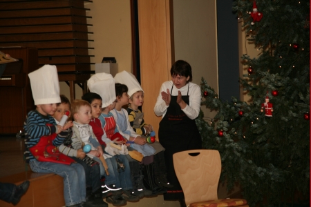 Nach dem alle Kochmützen mehr oder weniger sitzen, geht es mit Tamburin und vielen Utensilien in die Weihnachtsbäckerei.
